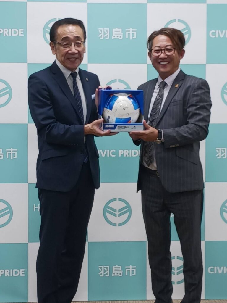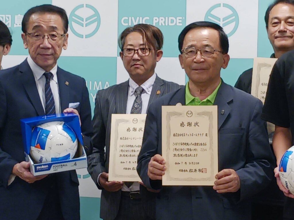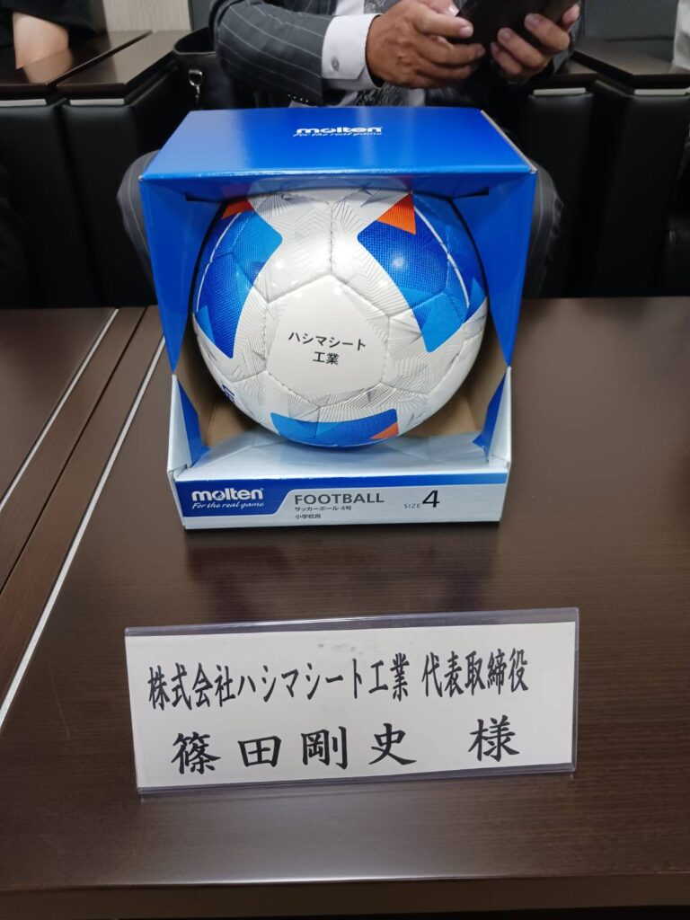 令和7年9月24日、羽島市へ弊社の社名が入ったサッカーボール15個を寄贈しました。