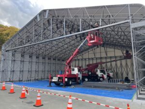 大開口のテント倉庫が完成しました。物の出し入れがどこからでも行うことができます。