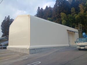 | 担当者のひとこと | スッキリとしたシンプルなテント倉庫です。屋根の上に強制換気の機能(ベンチレーター)を2基取り付けました。出入口には十分なサイズの庇をつけています。反対面にはマンドアを設け動線に配慮しています。出入口にはスロープ(勾配)をとって収納物の搬入にも便利な仕様にしています。 |