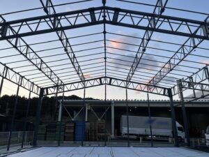 | 担当者のひとこと | 普段の切妻型とは少し変わった片流れ型のテント倉庫を施工中です‼弊社では見積もりから施工まで一貫して弊社で承っております。完全自由設計となっておりますのでお客様の要望に合わせたテント倉庫の建築が可能です。お気軽にお問い合わせください。完成後は後日投稿いたしますのでお楽しみに‼ |