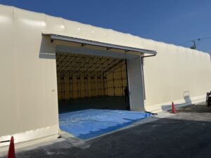 | 担当者のひとこと | 背の高いテント倉庫です。屋根の上には換気扇(ベンチレーター)をつけて換気に留意しています。サッシ窓も計10個取付。これらは全てオプションです。開口も一番大きく間取りました。大型車でも十分に出入りが可能です。 |