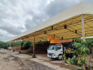 | 担当者のひとこと | 台風、突風による被害を受ける前に、古くなった生地を張り替えました。アイボリー色からグレー色への張替えです。倉庫内に保管されている製品・商品を毀損することなく倉庫を使用中の状態でも張替え作業は可能です。しっかりと養生をして保管物を保護したうえで作業をしています。必要であれば庫内の照明・電気設備一式の工事も承ります。テント倉庫の建設だけでなく、テント倉庫周辺の工事はなんなりとご相談下さい。 |