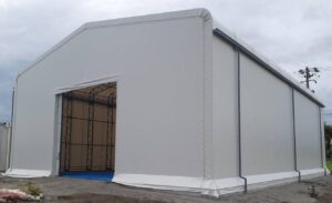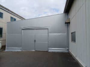 | 担当者のひとこと | アイボリー色を使用すれば、日中の作業には十分な照度がありますが、雨天や曇天での作業には、照明が必要な場合もあります。庫内での作業にも左右されますが、十分な明るさが必要であれば照明設備もご検討ください。LED照明を施工いたしました。内膜には燃え抜き防止用のガラスクロスを使用。出入口には注意喚起のための黄色い安全ポールを設置しています。庫内の壁面を保護するためにガードポールで周囲を囲みました。 |