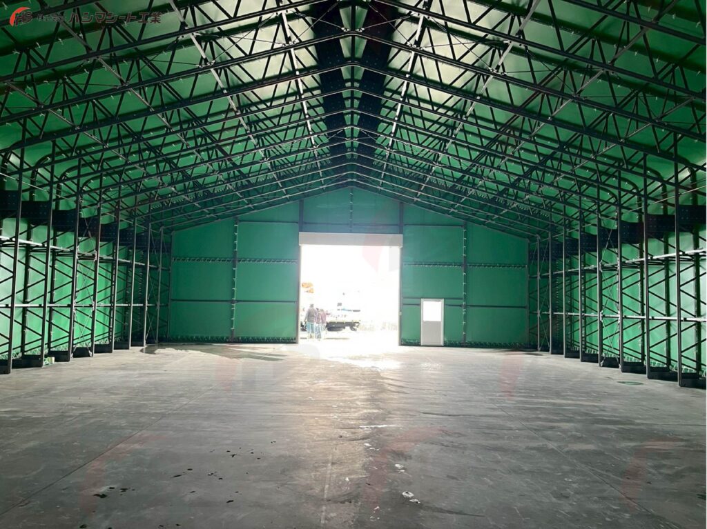 富山県 亜鉛メッキ仕様、生地はグリーン!大型のテント倉庫を建築しました!