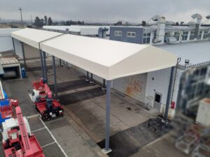 2023.02.24 上屋テント 衝立付きの上屋テントを建築しました |長野県 建設の場所 長野県 種別 上屋テント サイズ W3.8×L6 使用したテント生地 ウルトラマックス オプション 担当者のひとこと 衝立付きの上屋テントを建築しました。横からの降雨を最低限防ぎながら出入りしやすいようその他の面は全面開口としています。